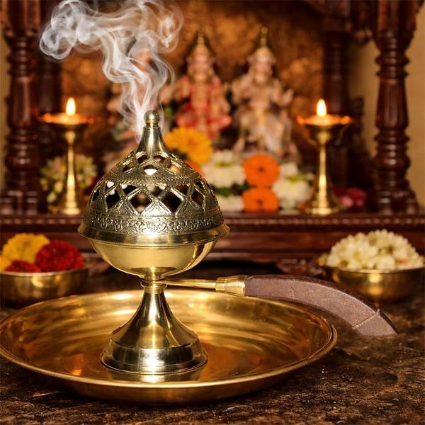 The sturdy pedestal base ensures stability, while the heat-resistant wooden handle provides a comfortable and secure grip for moving the burner during pooja or aarti. The antique brass finish and intricate detailing lend it a classic temple-inspired look, making it ideal for home mandirs, temples, meditation spaces, and festive rituals.