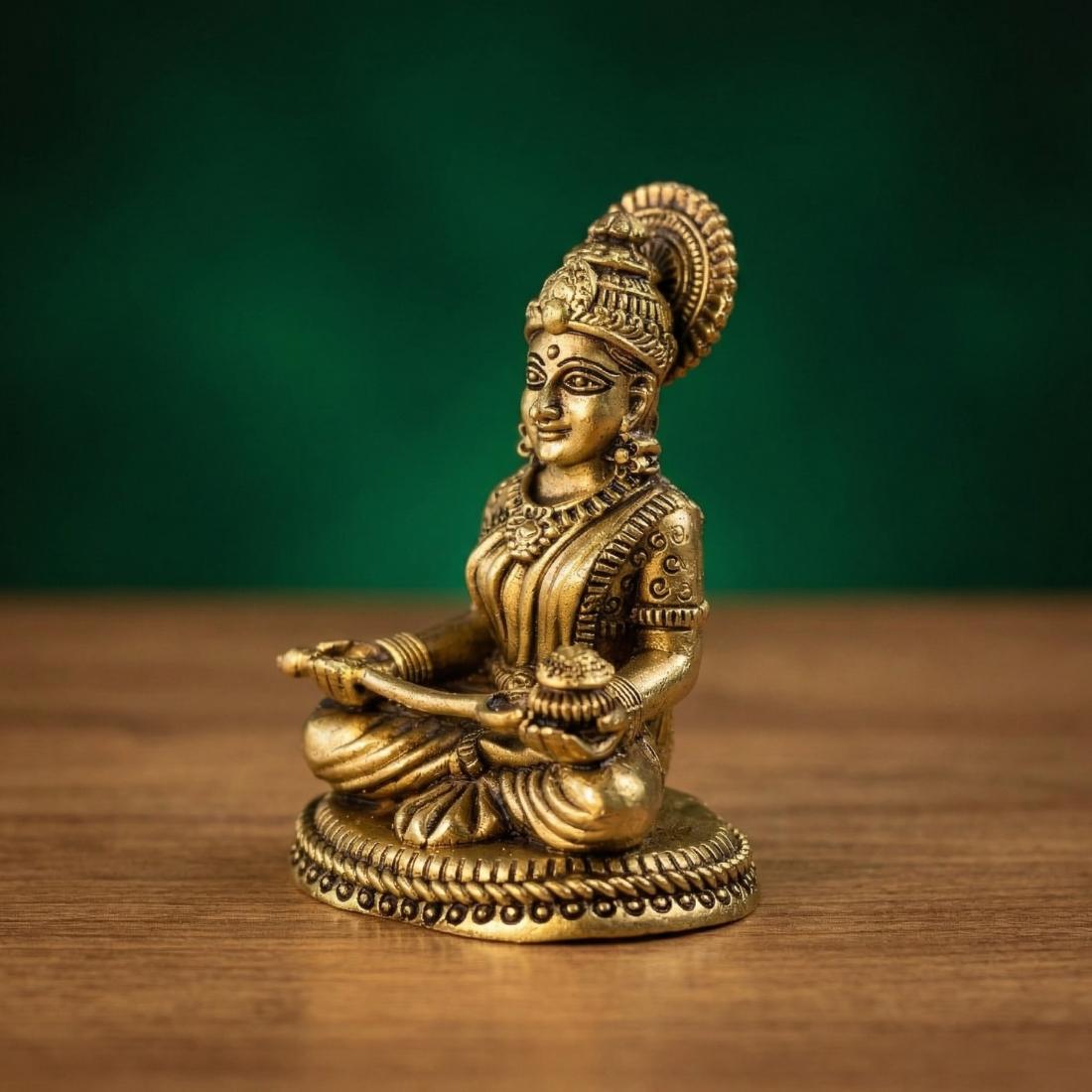 Bring divine nourishment, abundance, and blessings into your space with this Brass Annapurna Devi Mini Idol, beautifully crafted in premium brass with a traditional antique finish. This compact Annapurna Devi murti portrays the goddess seated gracefully on a decorative pedestal, holding a ladle and bowl—symbolizing food, prosperity, care, and the blessing of abundance. Its elegant miniature size makes it ideal for car dashboard placement, home temples, puja rooms, office desks, and sacred decor corners