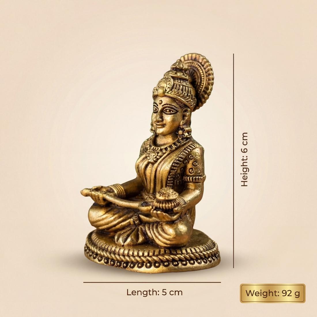Made from durable solid brass, this handcrafted idol combines devotional symbolism with compact utility. Goddess Annapurna is revered as the provider of nourishment and prosperity, making this murti highly auspicious for daily worship, travel blessings, and spiritual gifting. The detailed crown, facial features, and decorative base add traditional charm while allowing easy placement in small spaces.