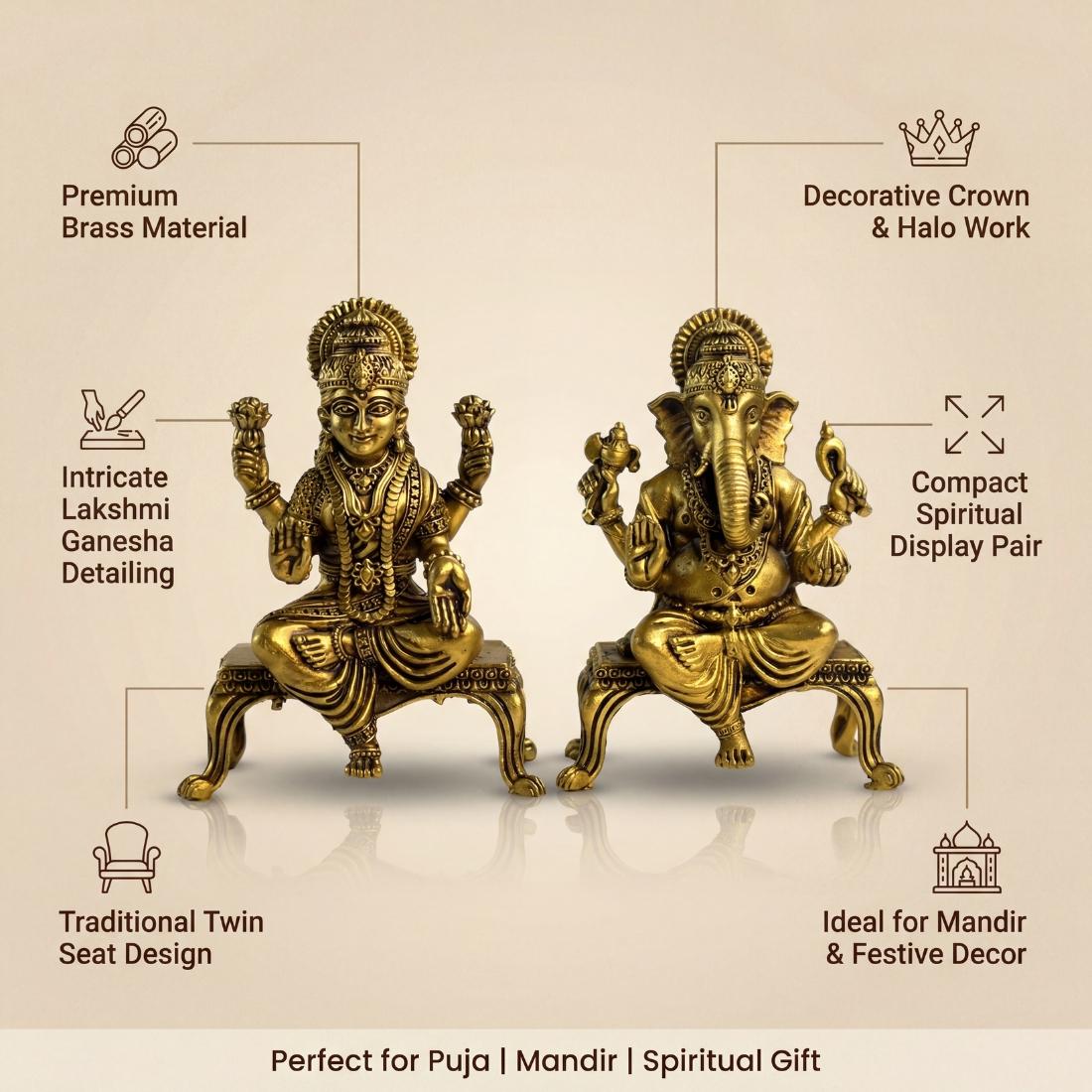 This Pure Brass Lakshmi Ganesha Idol Set is an exquisite addition to any spiritual space, meticulously designed to bring prosperity, wisdom, and auspicious energy to your home. Seated on individual traditional Singhasans (Twin Seats), these idols capture the divine essence of the Goddess of Wealth and the Lord of Beginnings.