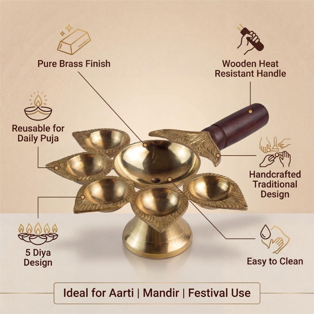 This brass panch aarti diya is designed for traditional worship, featuring five leaf-shaped oil lamp holders arranged around a central bowl for balanced illumination during prayer rituals. The sturdy wooden handle provides comfortable grip and safe handling while performing aarti in mandir, temple ceremonies, festive occasions, and devotional gatherings. Crafted with a polished metallic finish and stable pedestal base, it enhances spiritual ambience during daily worship, religious celebrations, housewarming events, and gifting, while offering durable long-term ritual use.