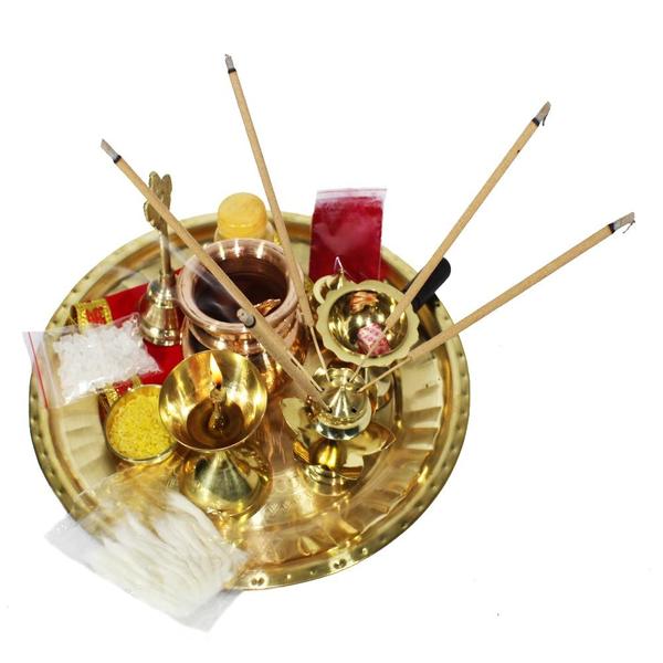 One of the processes to adore the spiritual in mythology is to use a decorated puja thali in different pujas. Here,the puja thali set comes in an impressive array which is presented by Dishan Enterprise, an outstanding choice to achieve an eternal atmosphere in your home as well as your mandir. This beautifully designed Puja Thali is made up of brass, it is robust and can sustain its consistency for coming years. This set has provided necessities which are convenient to use everyday at home & any festive occasions for performing Pooja. To bring a pleasant religious appearance and propagate an aura of deity and divinity in your room,you can retain this set in the puja room. This Puja Thali can be an ideal also to give your dear ones to pass on your best wishes, an ideal gift for having Housewarming anniversaries,religious-gifts & Indian festivals. In this Thali you will get a thali along with a Panchapatra, Ghanti, Akhand Diya, Agarbatti Stand, Karpur dani, sindur dani, a small katori, Aasan and necessary Puja ingredients.
