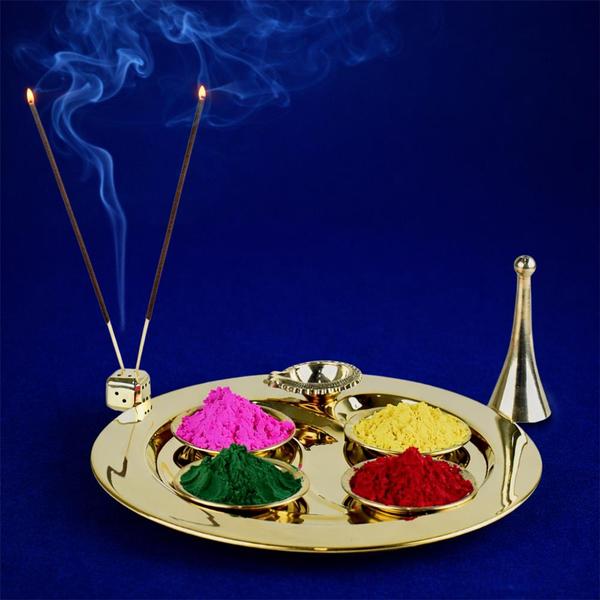 The set includes four small plate ideal for gulal colors, kumkum, haldi, or chandan, along with an incense stick holder and decorative diya. Its traditional design and polished surface make it a beautiful centerpiece for your Holi celebrations and a thoughtful gift for family and friends.