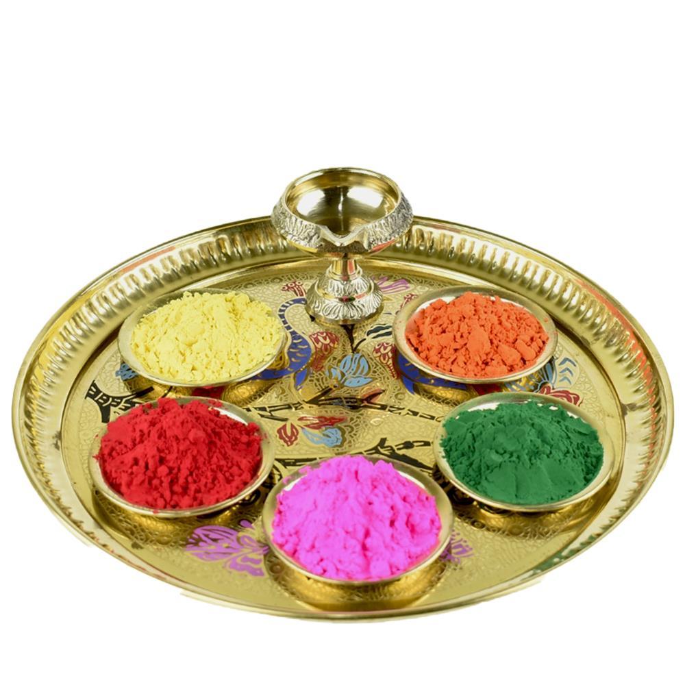 Celebrate Holi with tradition and elegance using the Holi Festive Thali with Diya. This beautifully designed festive thali set includes colorful gulal bowls and a decorative diya, making it perfect for Holi rituals, pooja, and festive celebrations.