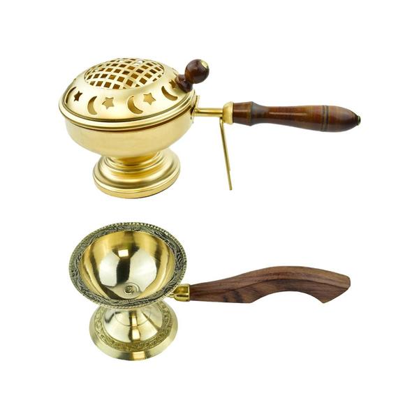 Loban Dhoop Dani Burner with Wooden Handle and Brass Dhoop Burner with Round Dome