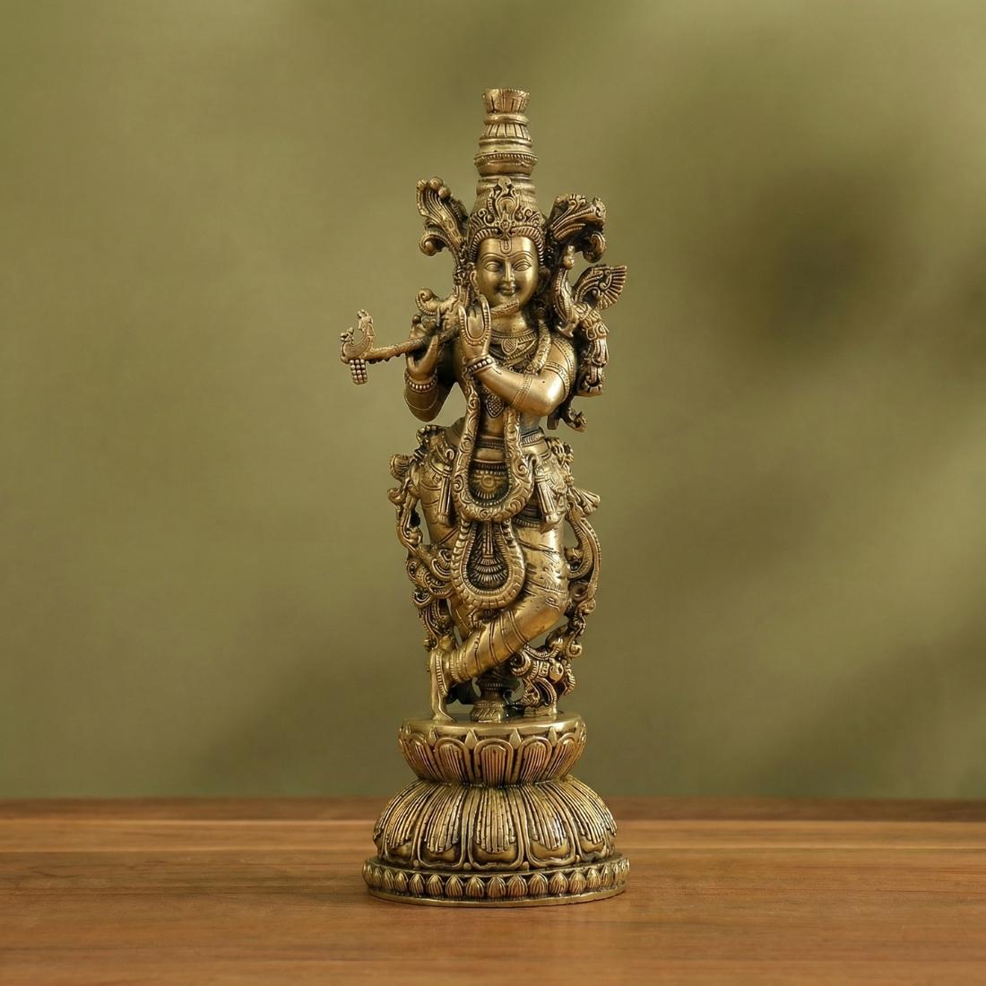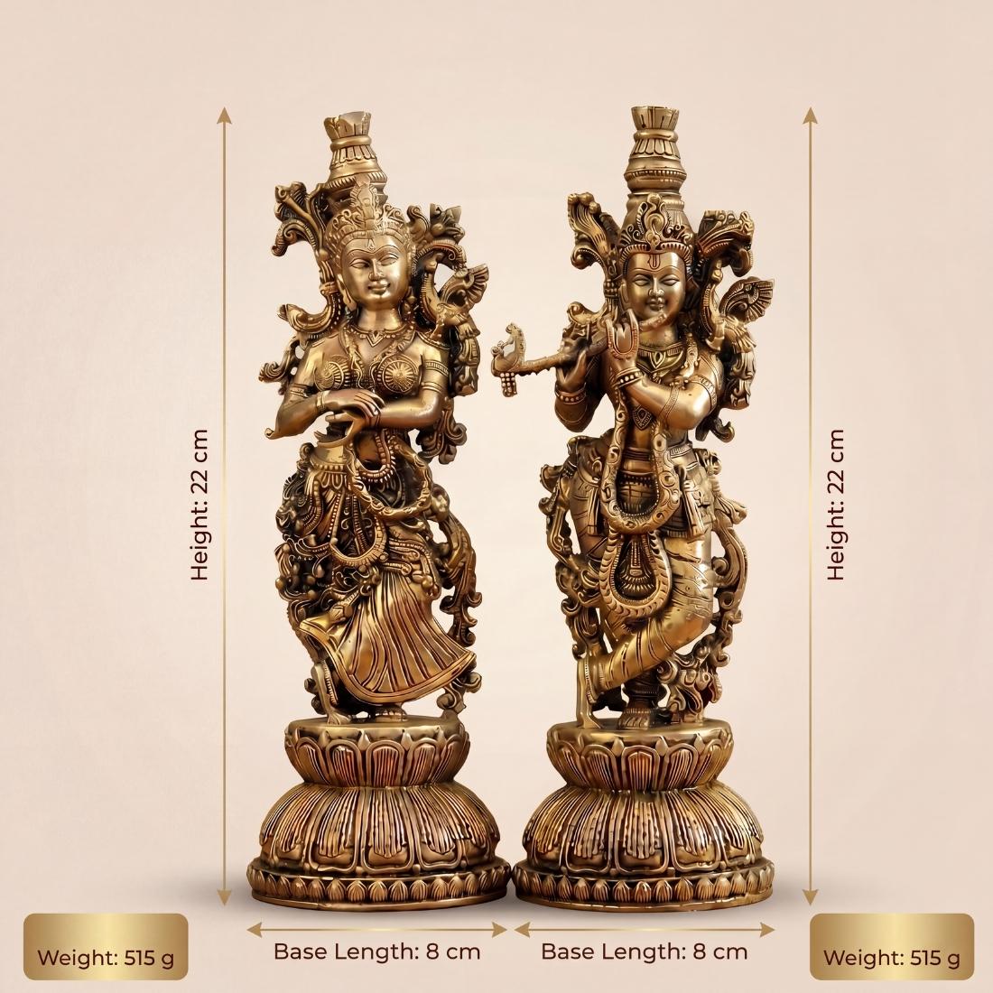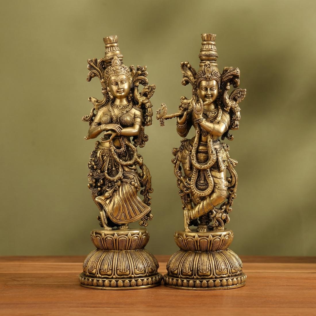 Bring divine love, harmony, and devotional elegance into your sacred space with this Premium Brass Radha Krishna Idol Set, beautifully crafted in premium brass with an antique finish. This exquisite standing Radha Krishna murti pair depicts Lord Krishna gracefully playing the flute beside Radha, symbolizing eternal love, devotion, peace, and spiritual harmony. The intricate crown work, ornamental detailing, and decorative lotus pedestal make this idol set a striking addition to home temples, puja rooms, living spaces, and spiritual decor settings