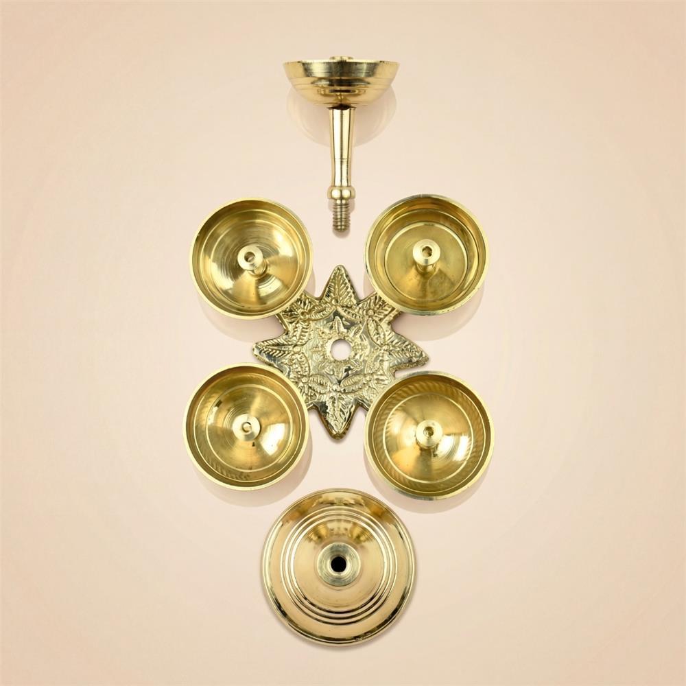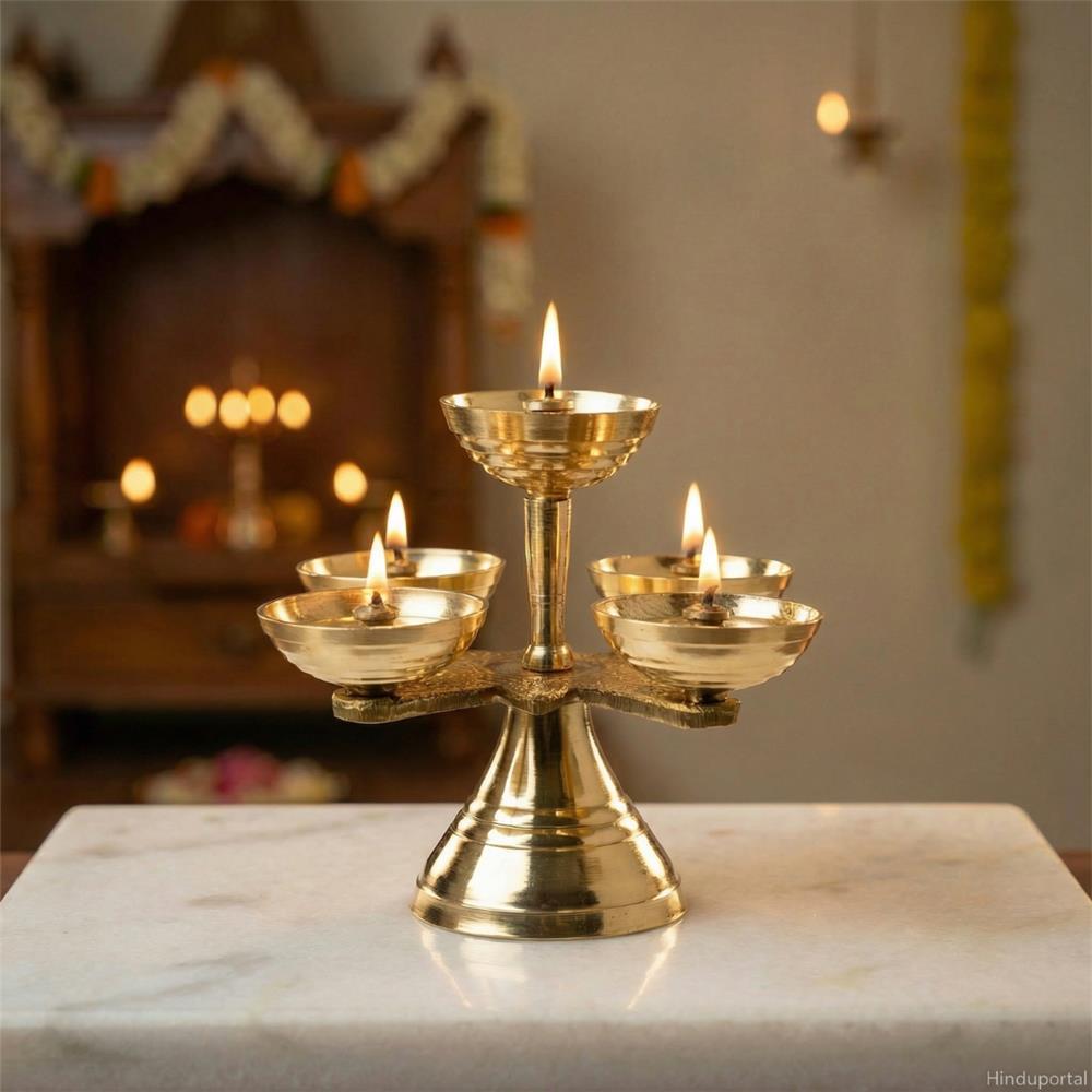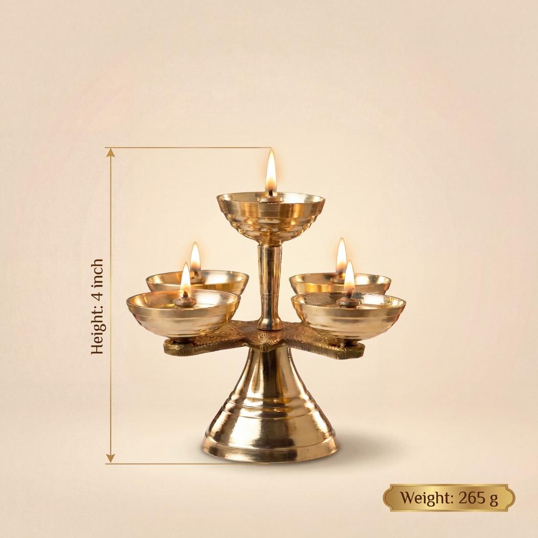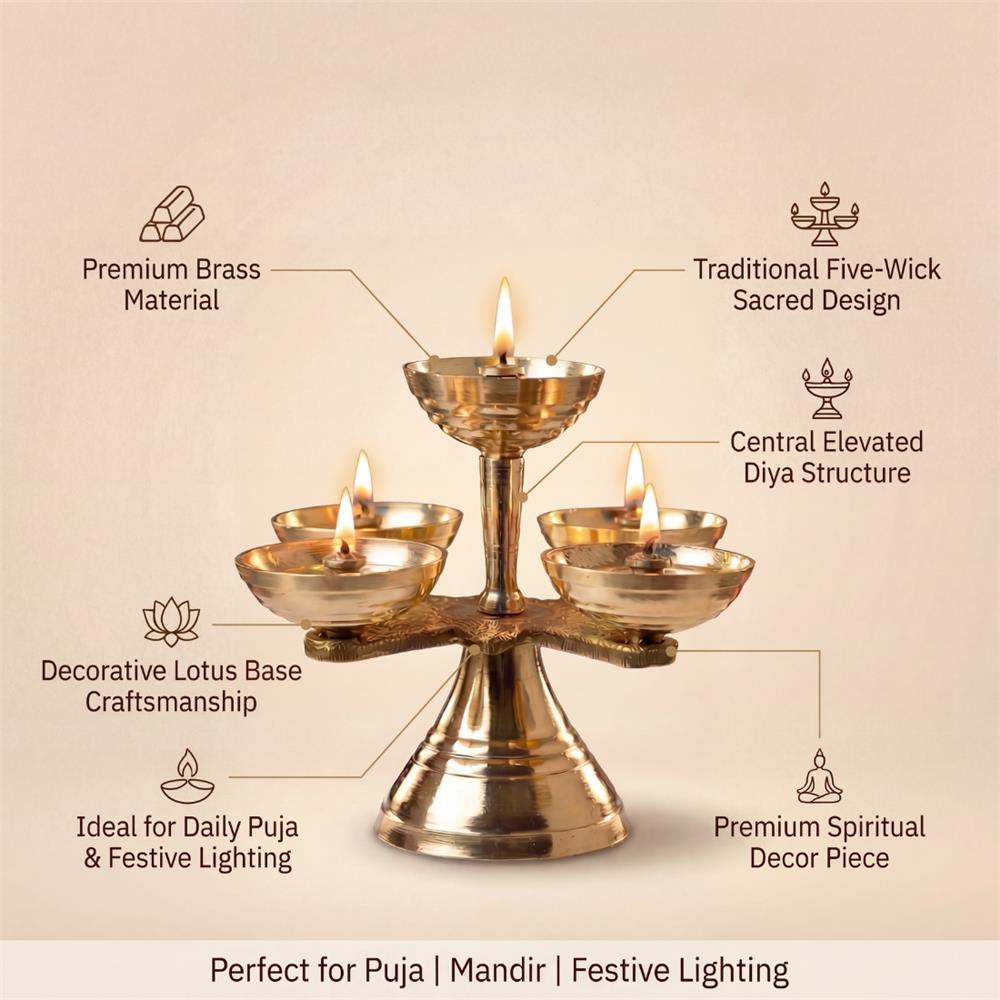 Illuminate your sacred space with this beautifully crafted Pure Brass 5 Wick Diya Stand, designed in a traditional Panch Aarti Deepam style for daily worship and festive rituals. Made from premium-quality solid brass, this diya features five evenly placed oil bowls with an elevated central lamp, creating a balanced and auspicious lighting arrangement ideal for spiritual ceremonies.