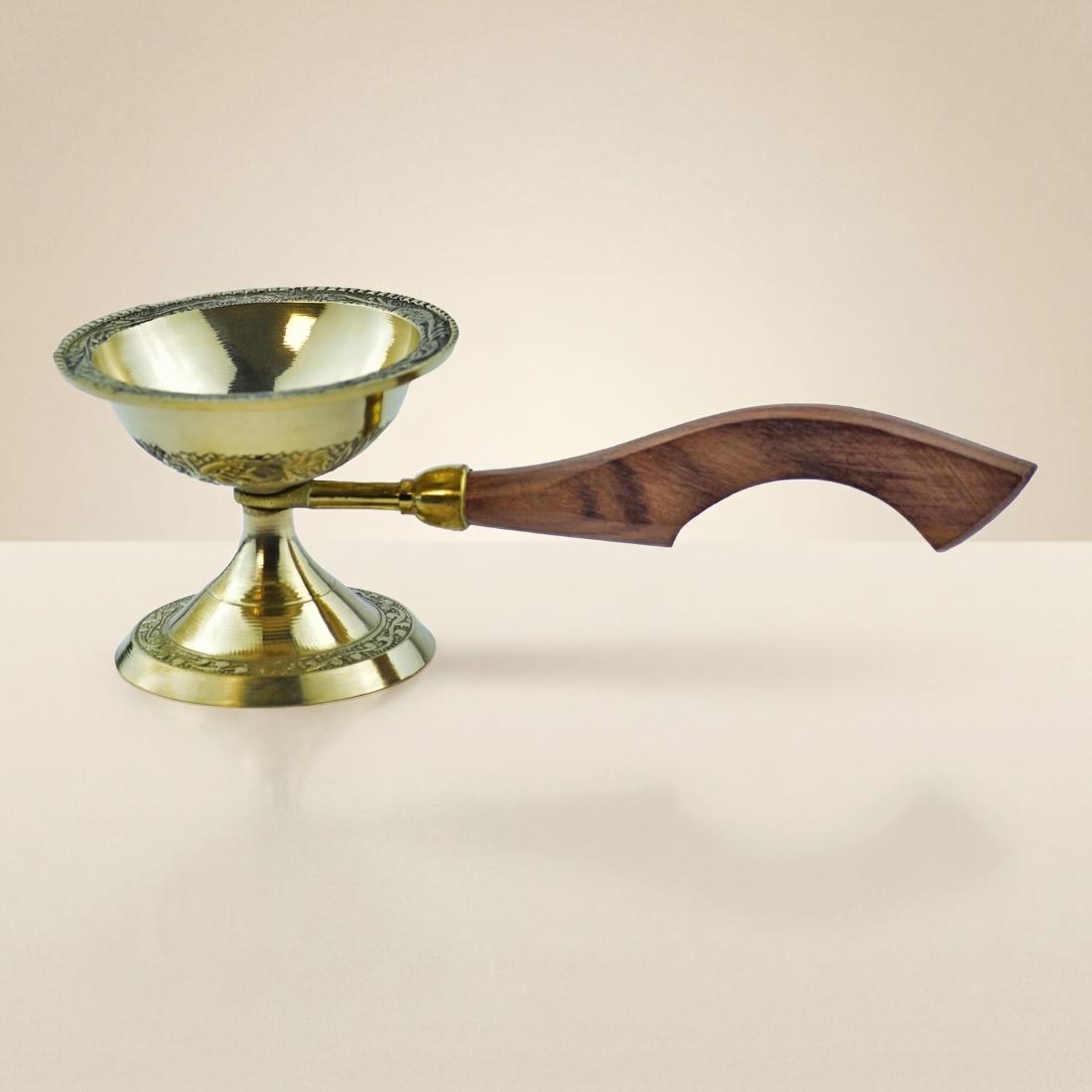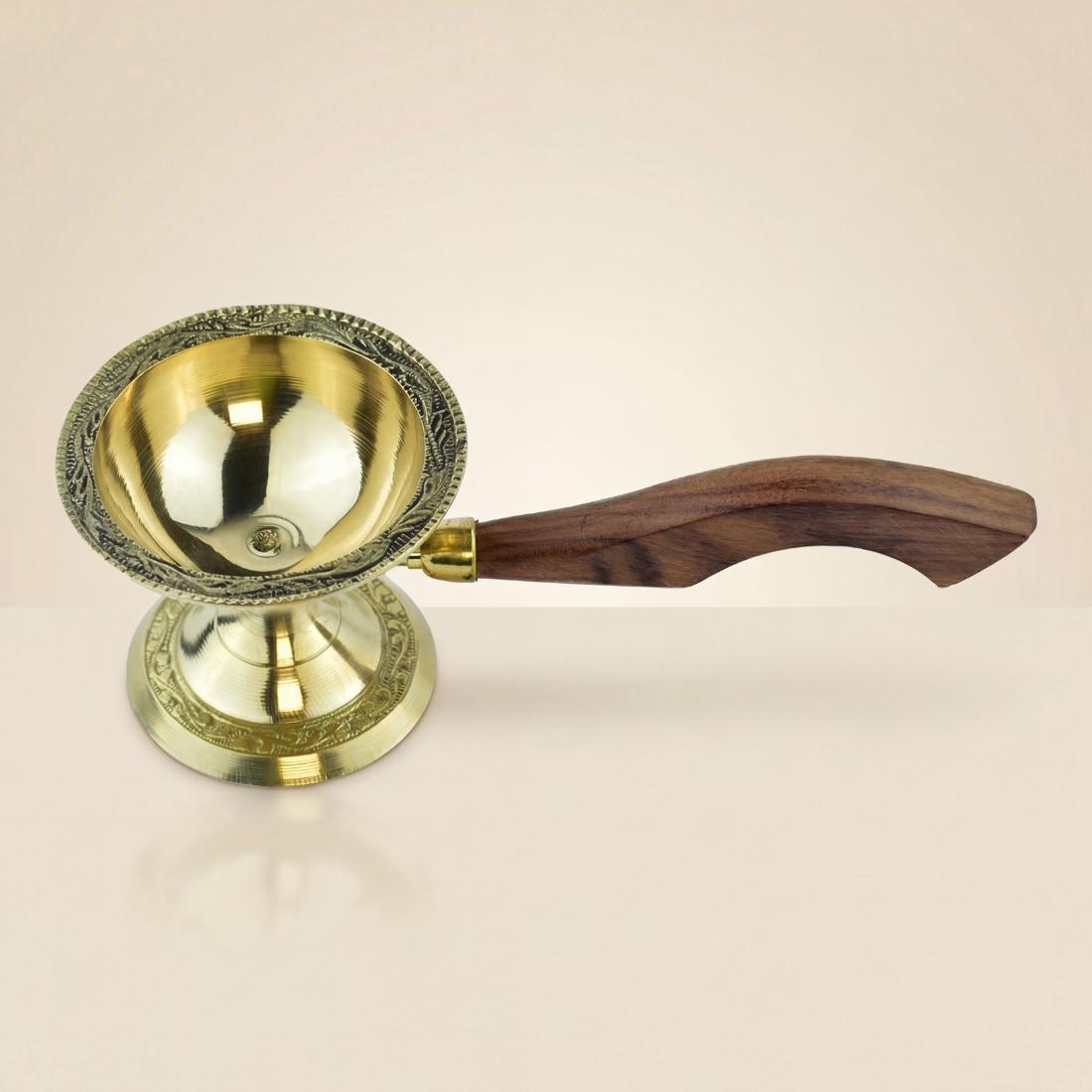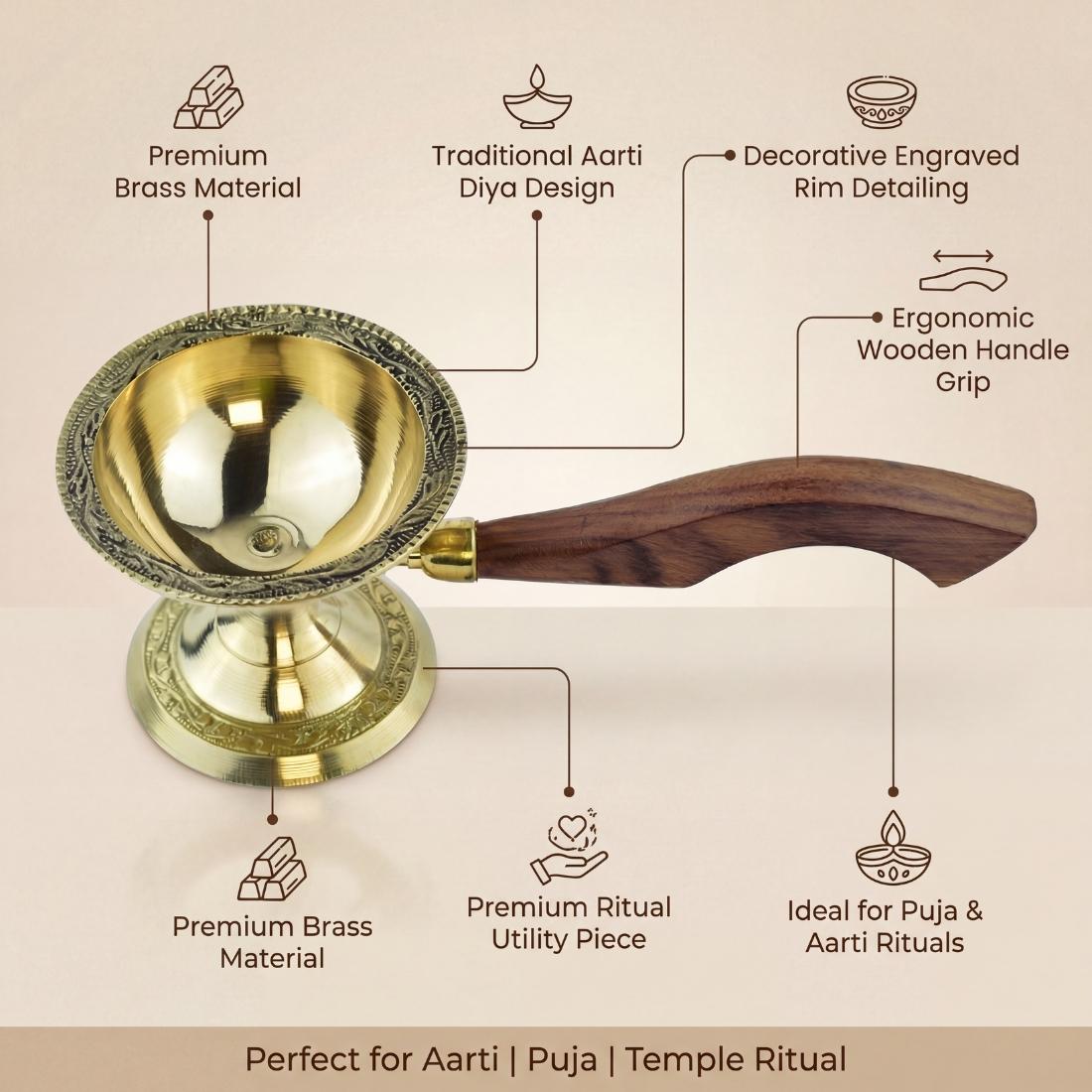 To ensure complete comfort and safety during your devotional offerings, this diya features a distinctly curved, ergonomic wooden handle. This allows you to easily hold and rotate the diya during lengthy aarti ceremonies without the heat of the flame reaching your hands. Accented with stunning engraved detailing along the rim, it serves as a magnificent centerpiece for your home mandir and festive celebrations.