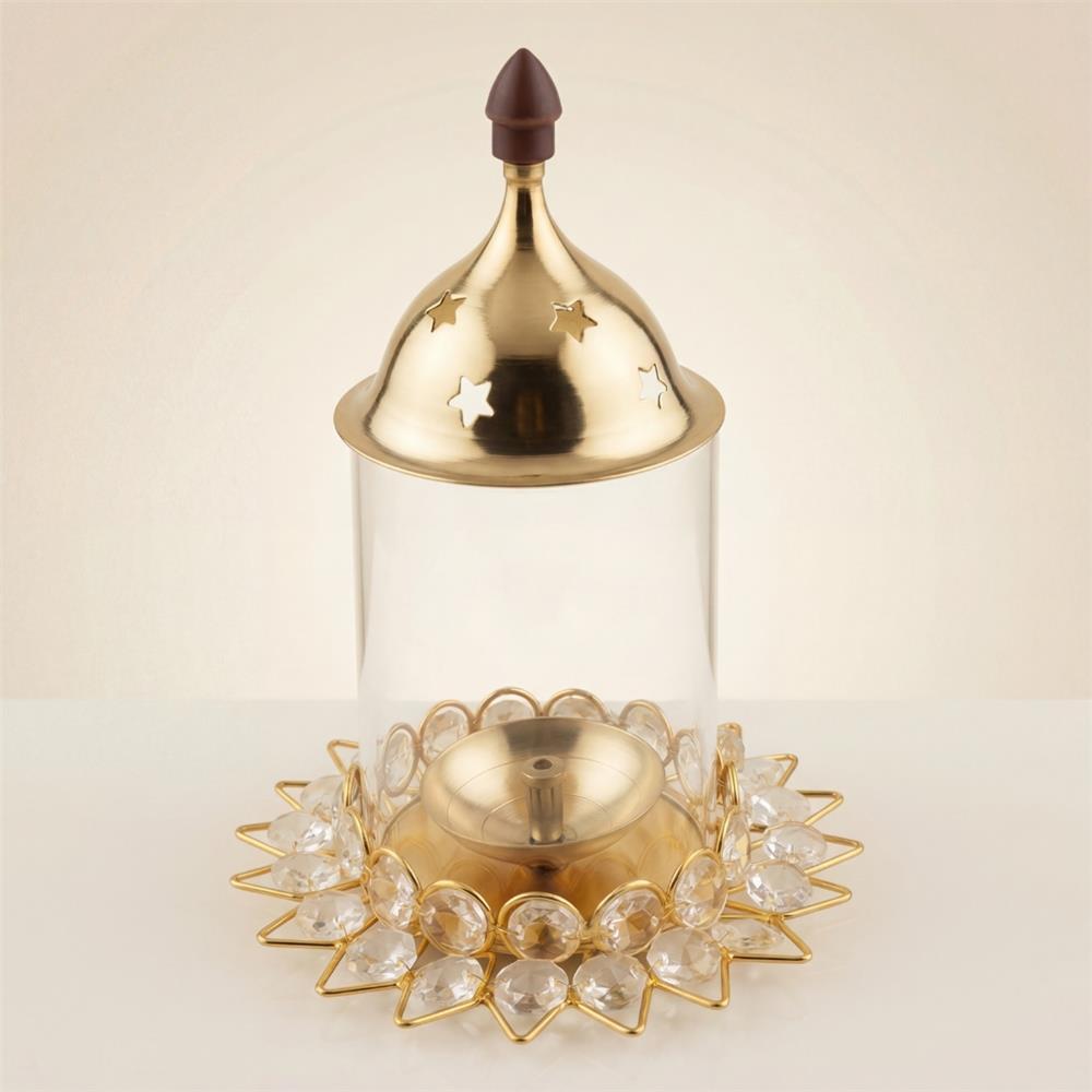 PURE BRASS COMPONENTS: The oil chamber, base frame, and top dome are forged from 100% pure, rust-resistant brass. The traditional golden finish offers a striking, royal contrast against the modern glass and crystal elements.