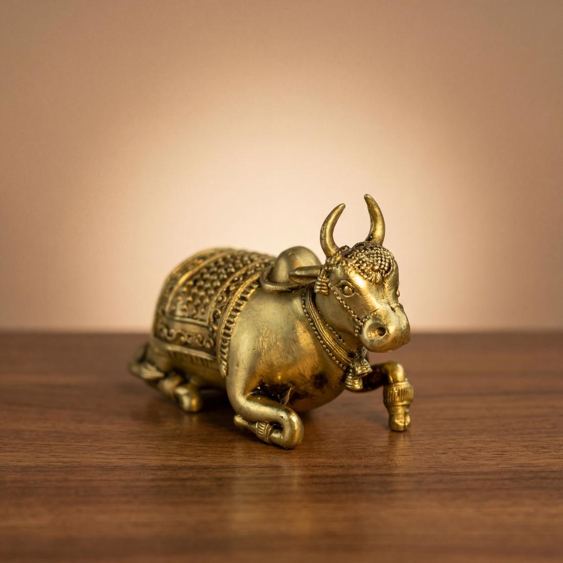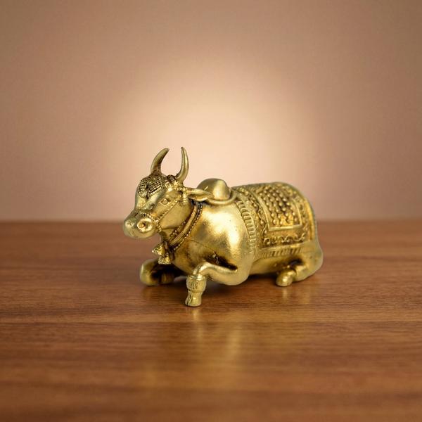 The compact handcrafted design features intricate engraving, traditional resting posture, and an elegant spiritual appearance that blends perfectly with devotional interiors. This brass cow idol is ideal for daily worship, festive decoration, meditation corners, and sacred display arrangements.