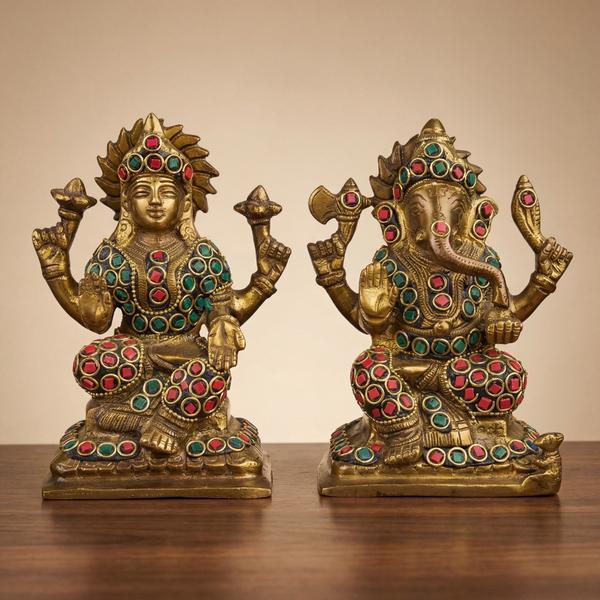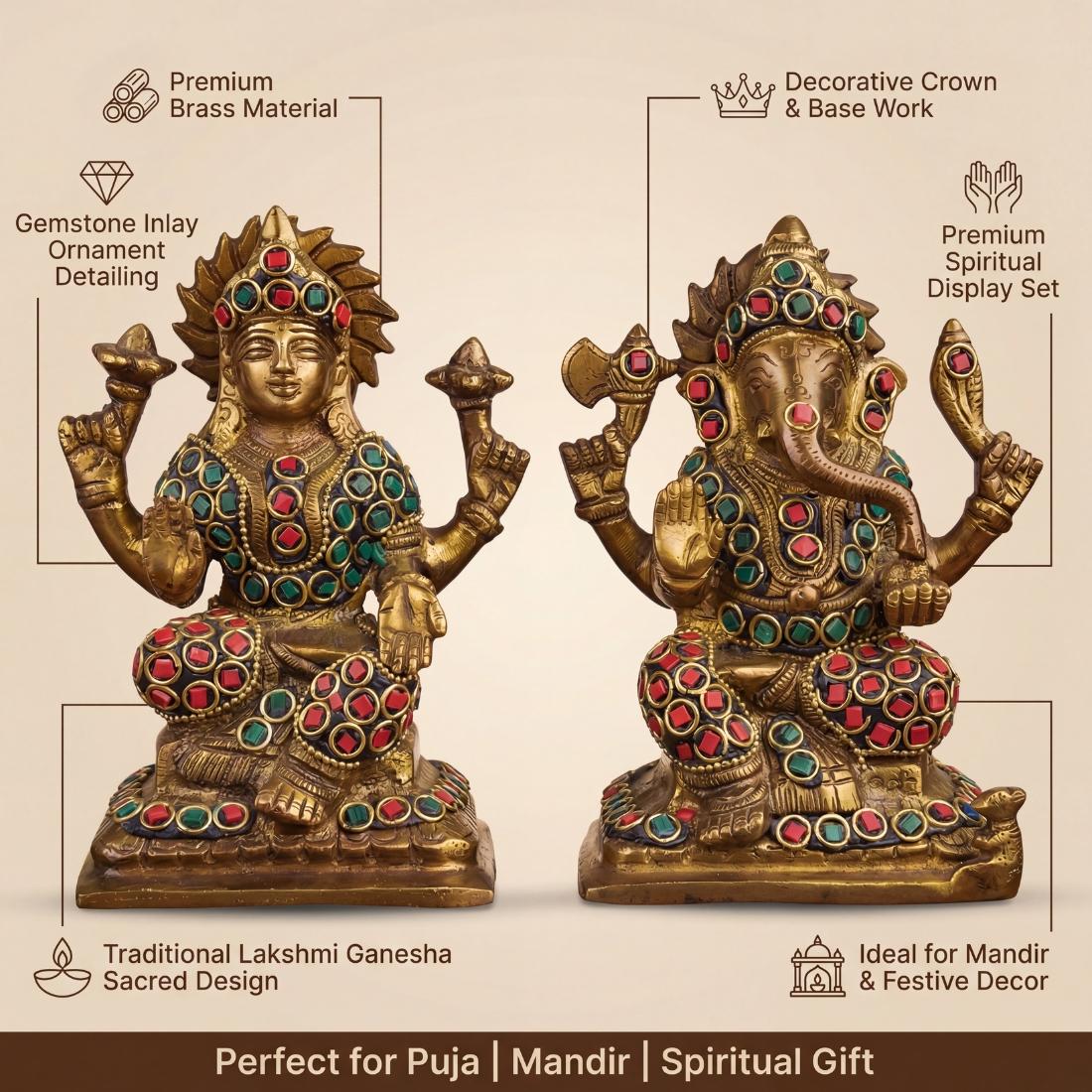 Pure Brass Lakshmi Ganesha Idol Set with Double Stone Inlay for Home Temple, Puja Mandir, Diwali Decor & Spiritual Gift